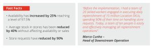 The implementation of OneBeat started as a Proof of Concept for a duration of six months. Three stores were chosen to assess the value of the software. During the POC time, initial buffer targets were calculated by OneBeat and challenged on a daily basis to capture market behavior in real-time. Results exceeded expectations with an average stock reduction of 15%, while availability increased by 20%.